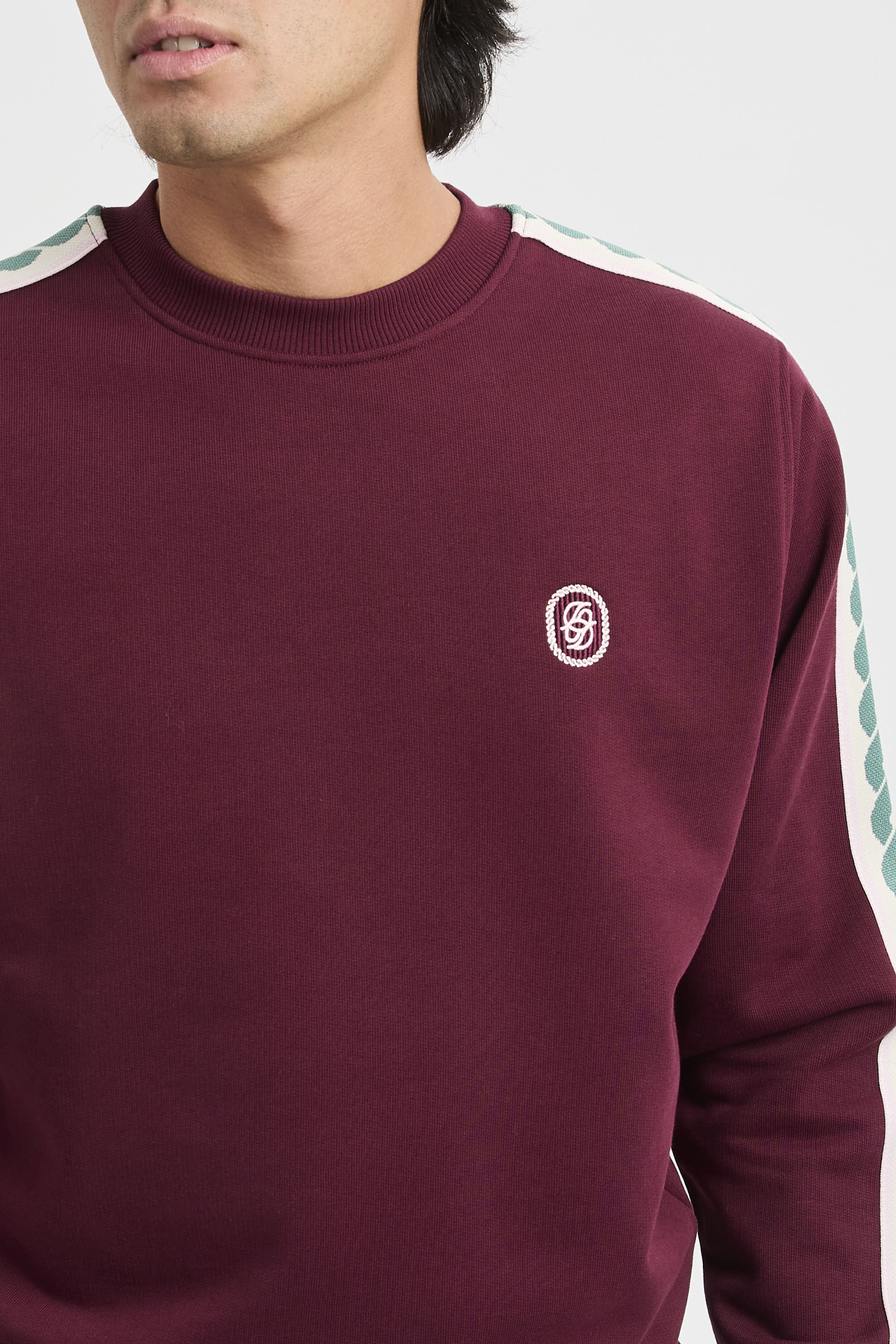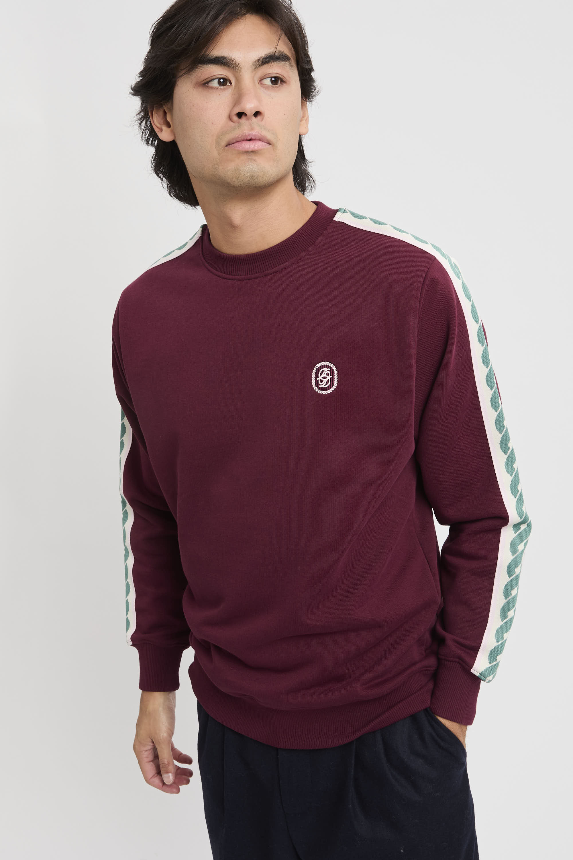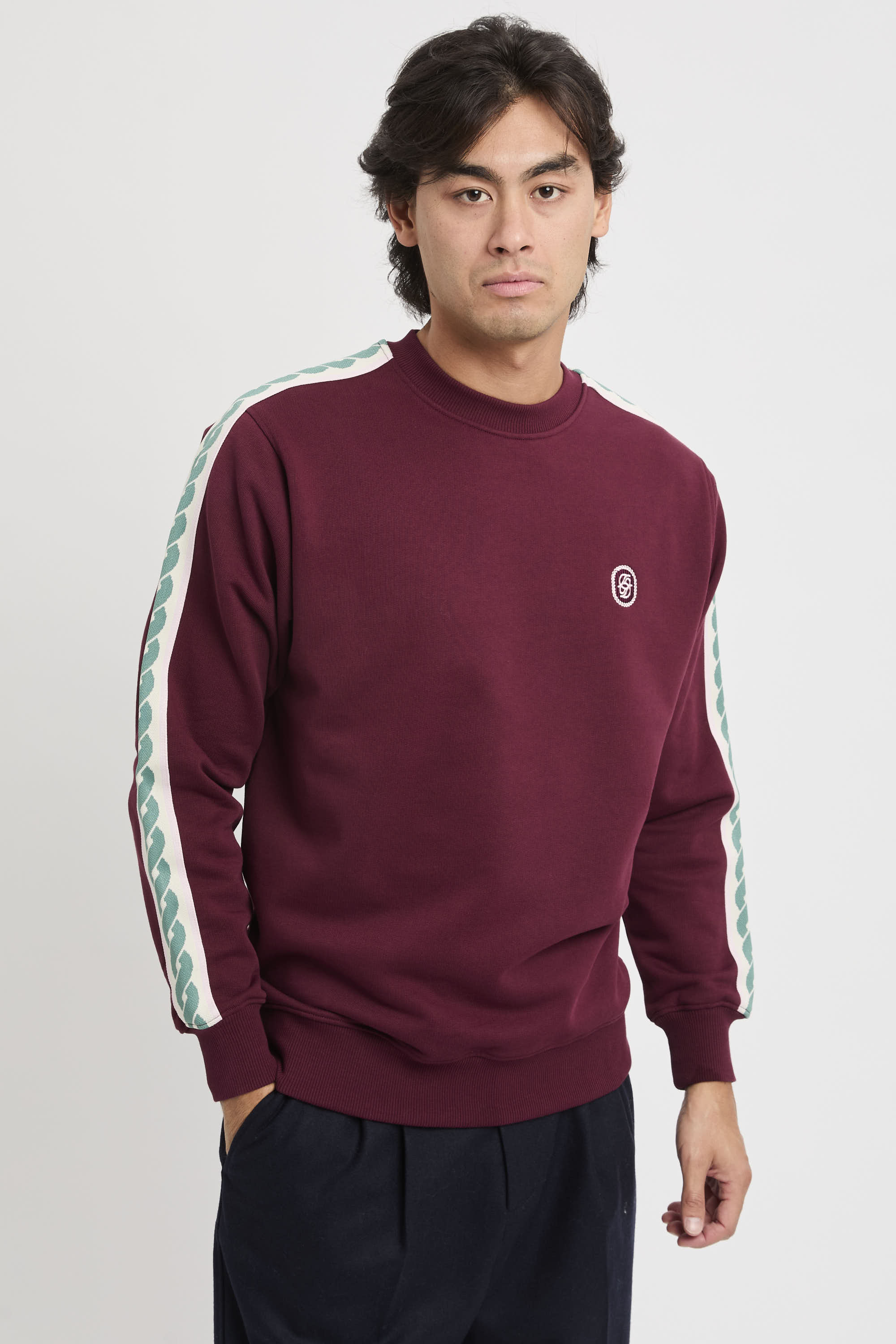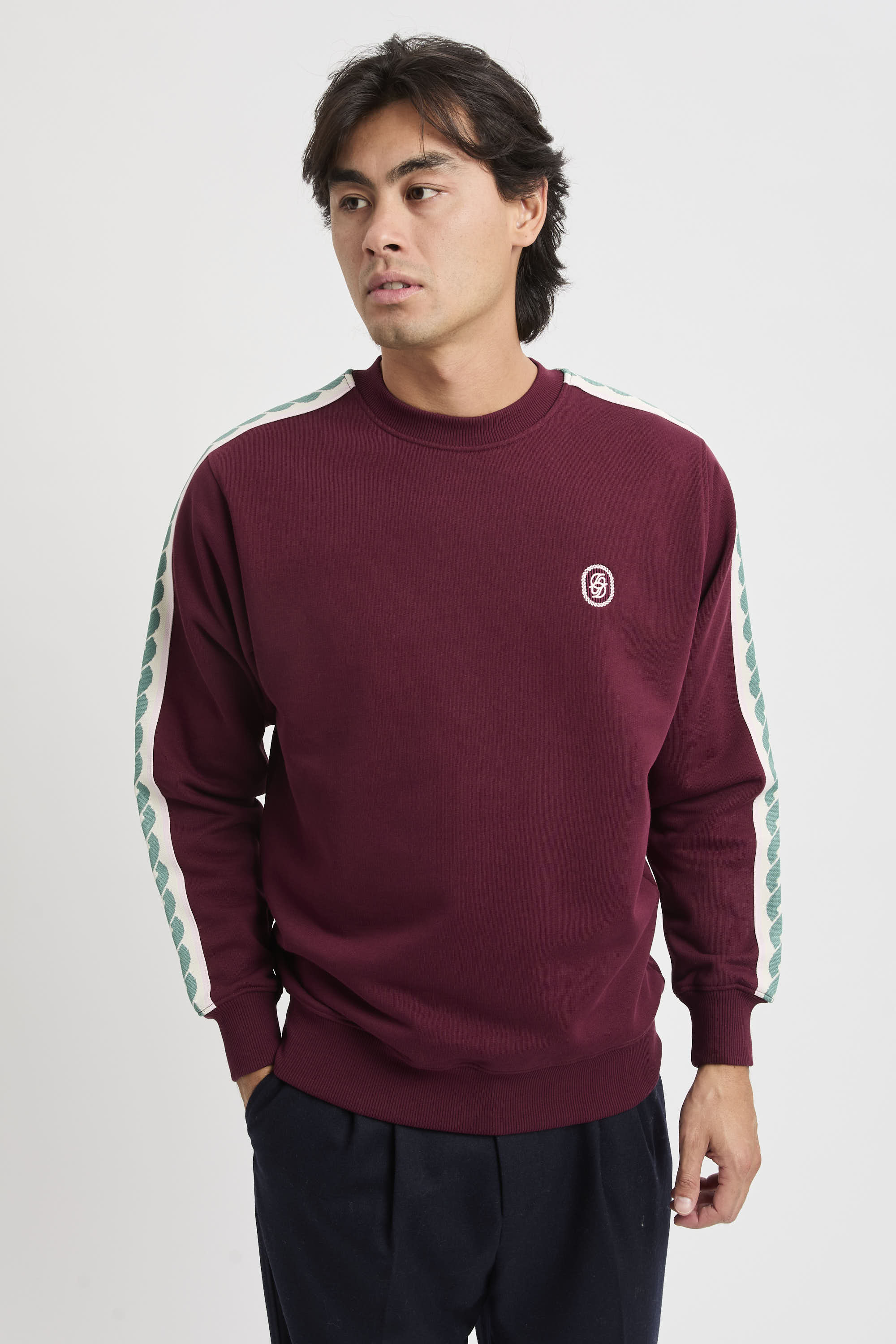 - Gespiegelte D-Stickerei auf der Vorderseite und gewebter Besatz an den Ärmeln