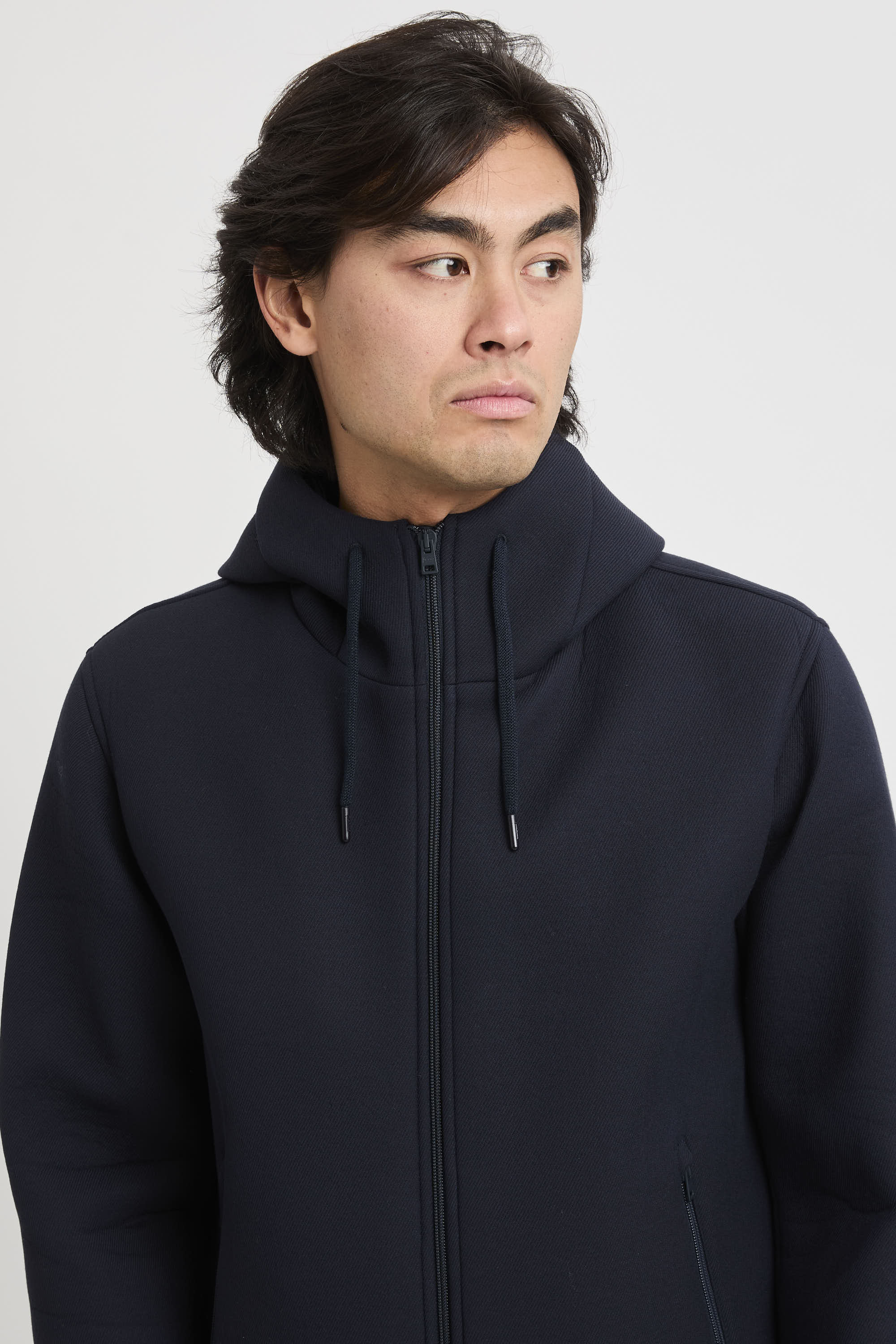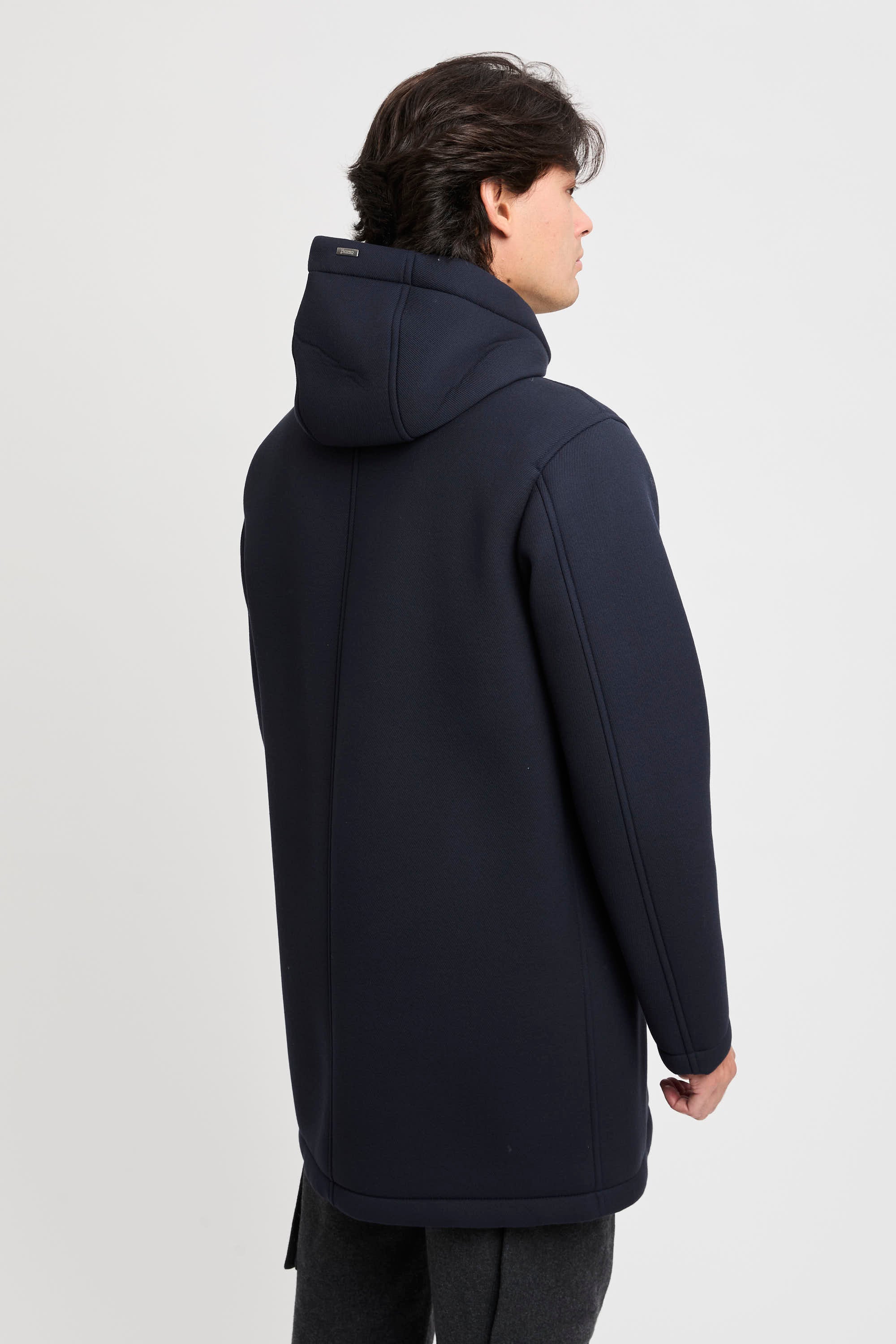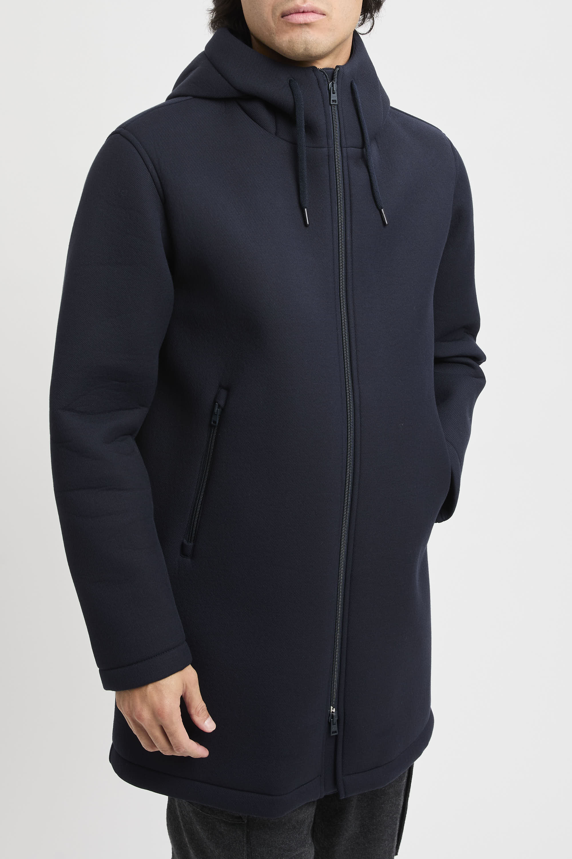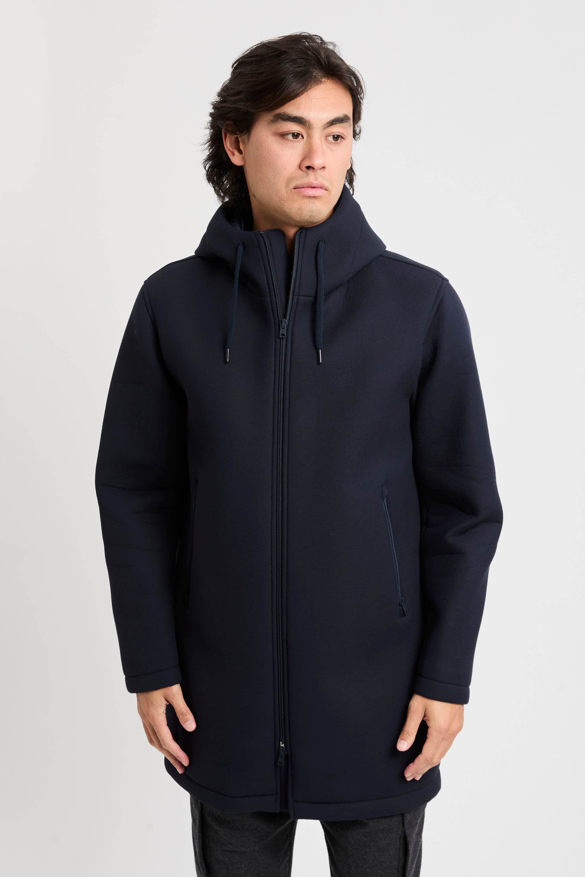 - Langer dreilagiger Parka aus diagonalem Viskose-Jersey außen, Polyurethan-Zwischenschicht, Polyester-Jersey innen