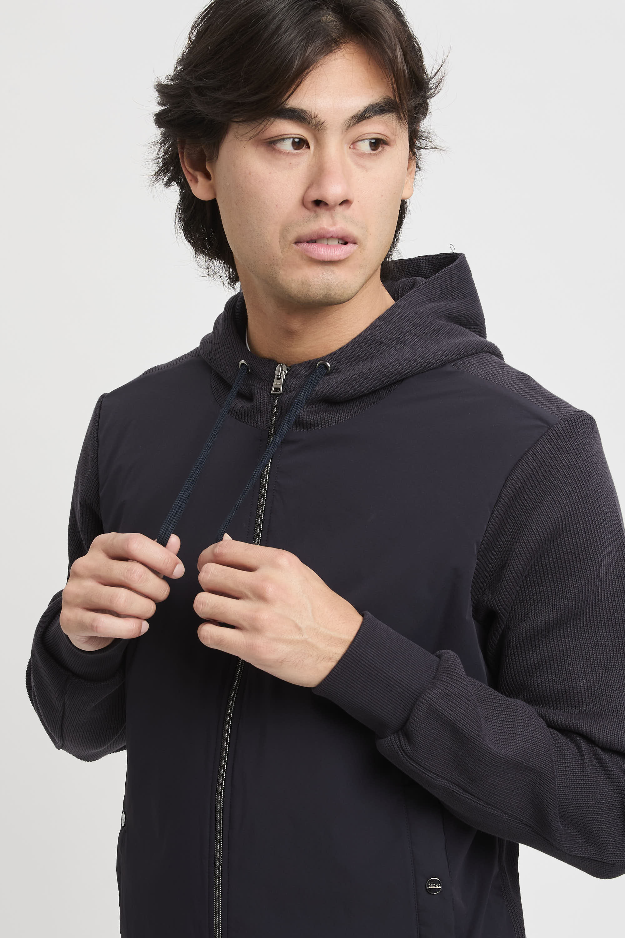 - Giacca in interlock da 420 GR/MTQ smacchinato in filato di cotone, con texture simile alla maglia calata
