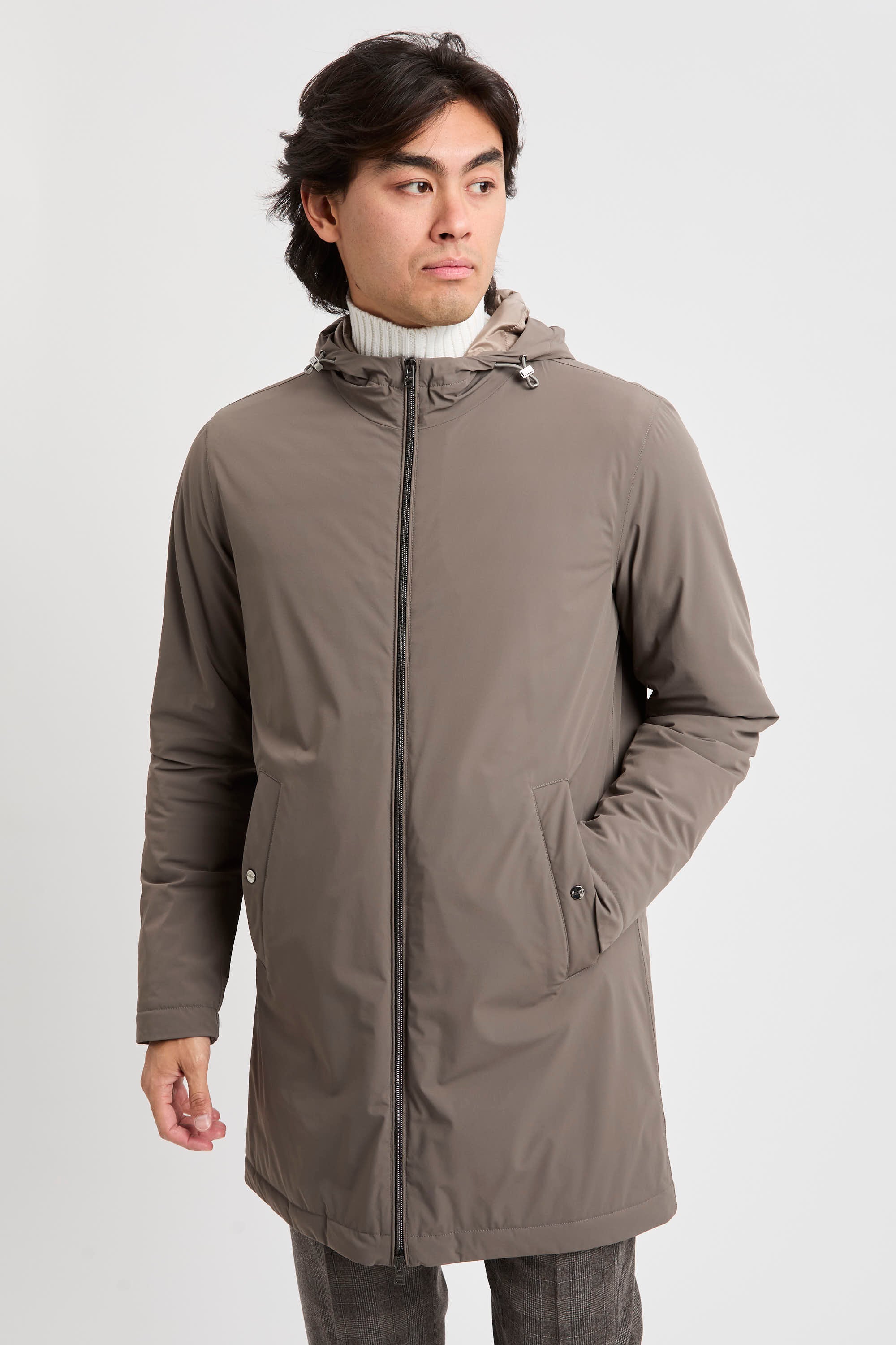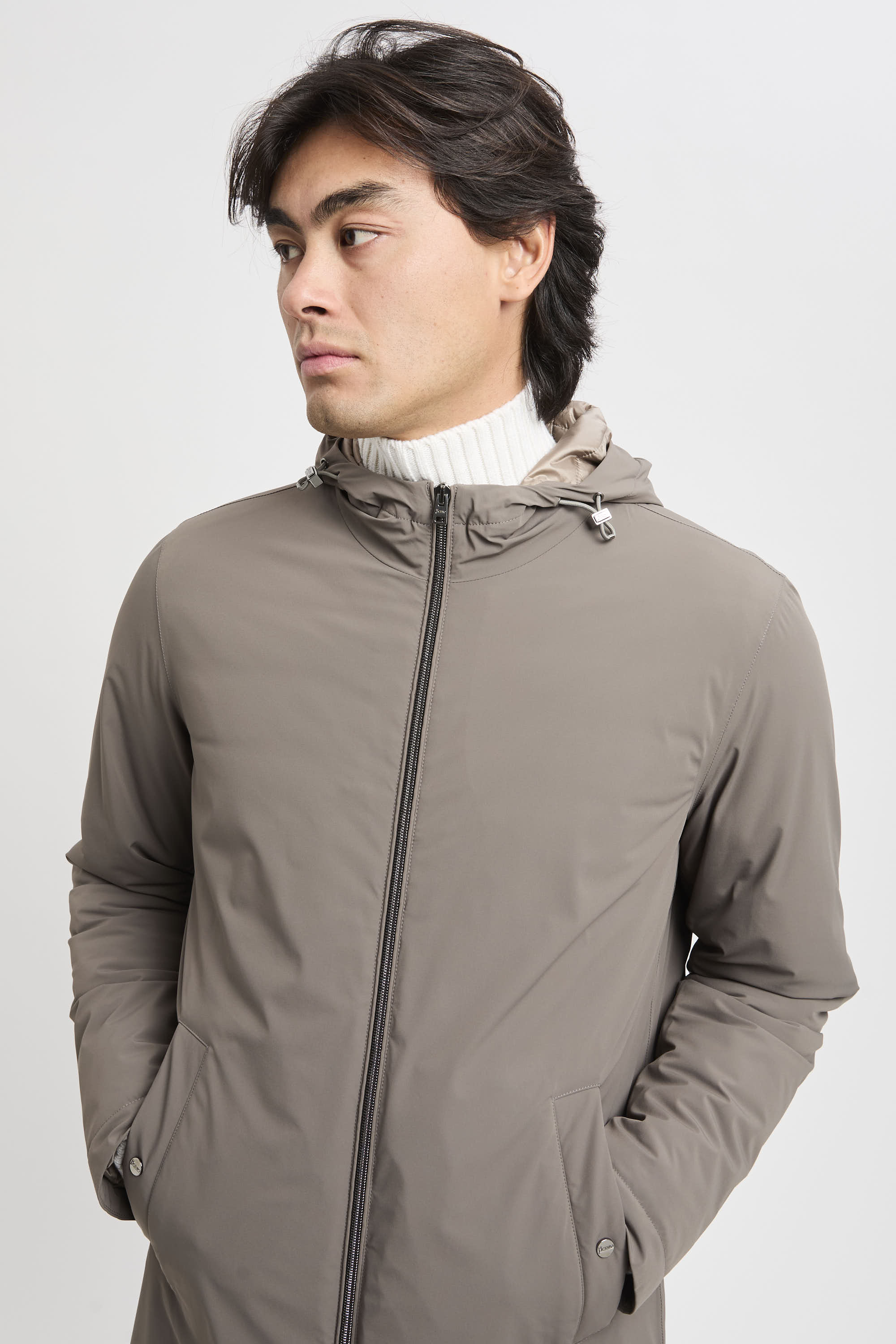- Parka realizzato in un tessuto composto da un filo 30 denari di nylon che avvolge e ricopre un filo 20 denari di elastane sia in trama sia in catena