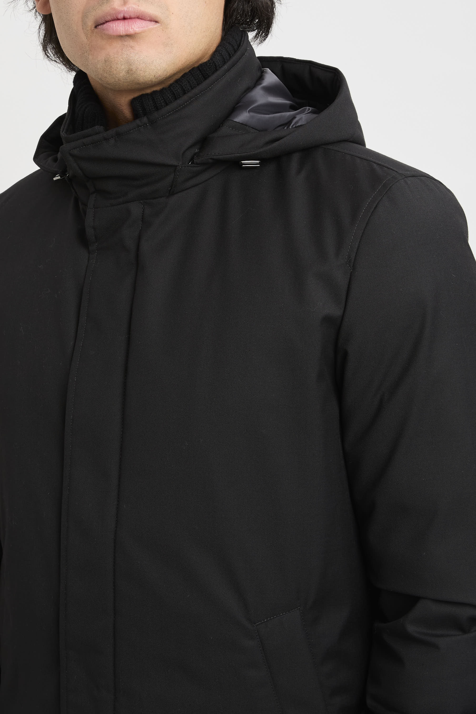 - Giaccone in tessuto tecnico trattato per riprodurre l’aspetto di un pettinato laniero