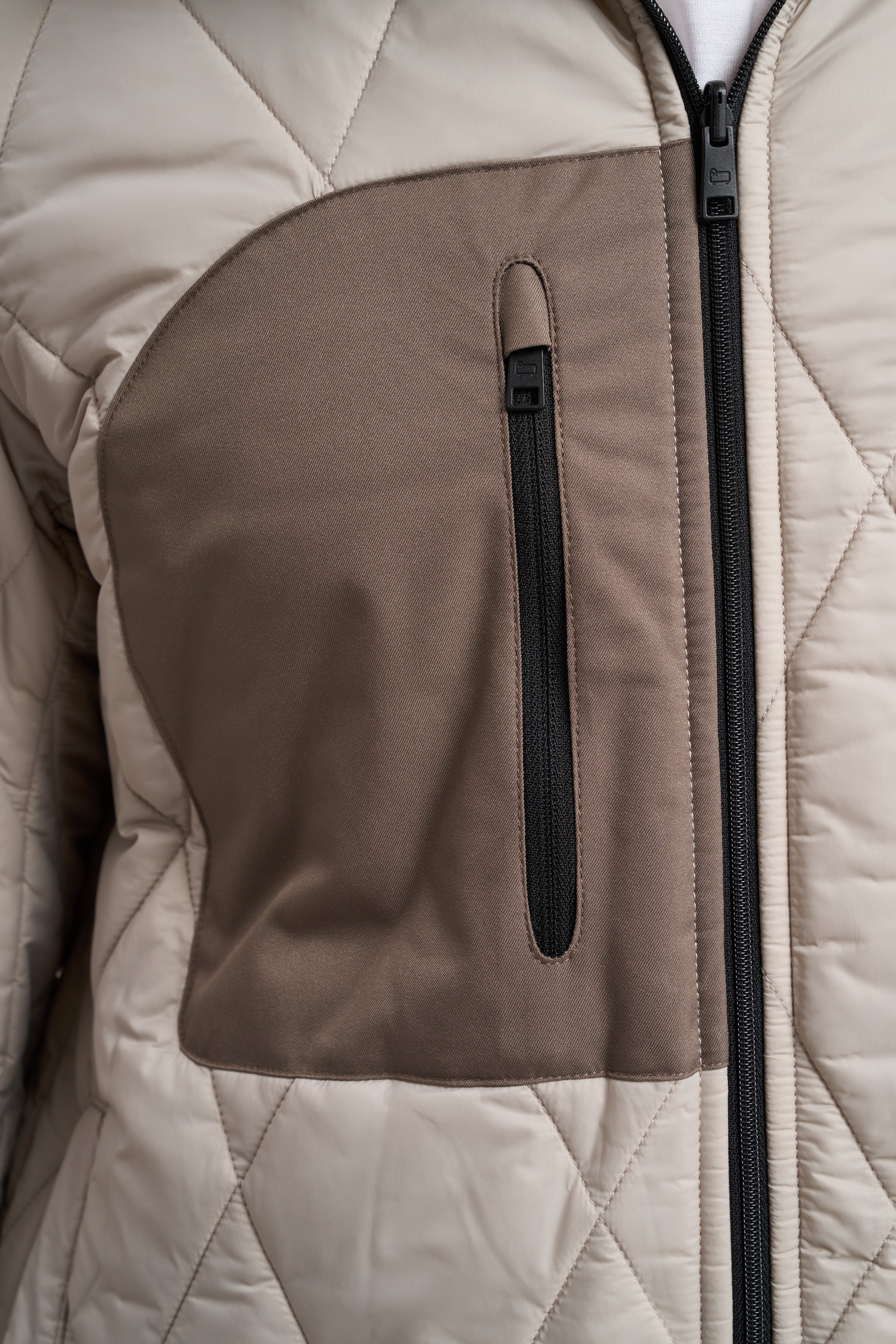 - Chiusura frontale con zip bidirezionale impermeabile parzialmente coperta da patta